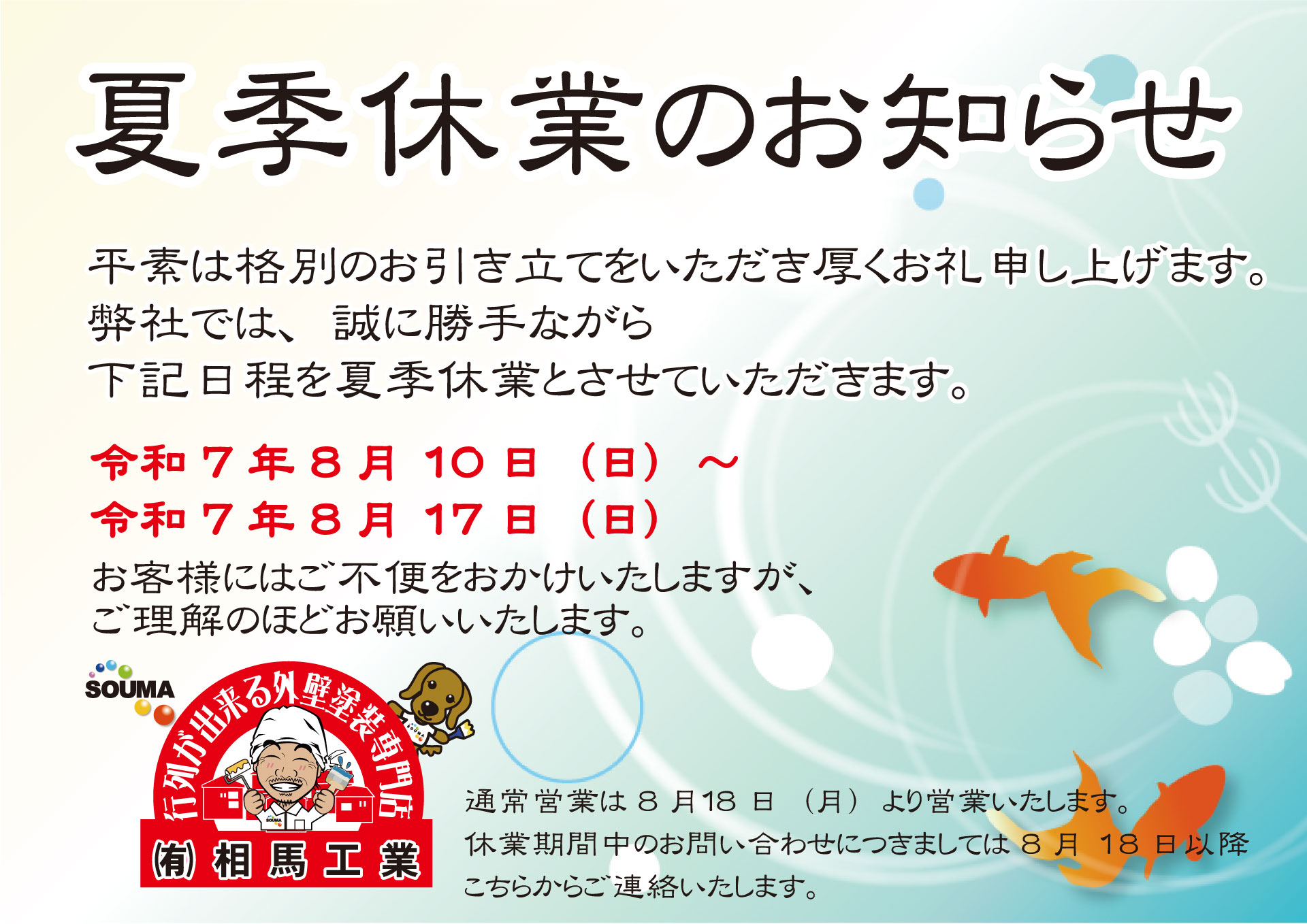 夏季休業のお知らせ|相馬工業スタッフブログ