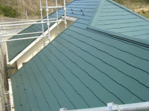 屋根下塗り:㈱日本塗装名人社 UVルーフプライマーSI屋根中塗り・上塗り:㈱日本塗装名人社 フッソUVコート溶剤Ⅱ遮熱