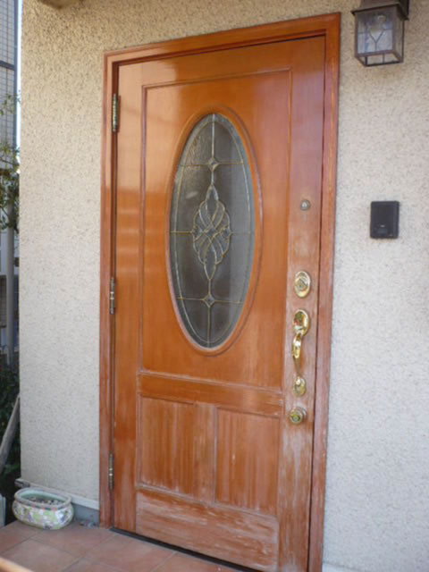 2012年4月に施工致しました。お家のお顔である玄関ドアが見事に蘇りました!ご覧下さい、この輝き!!親方の力作です!!剥離作業と研磨施行を繰り返し、仕上げにニスを塗装して、新品に復元致しました。