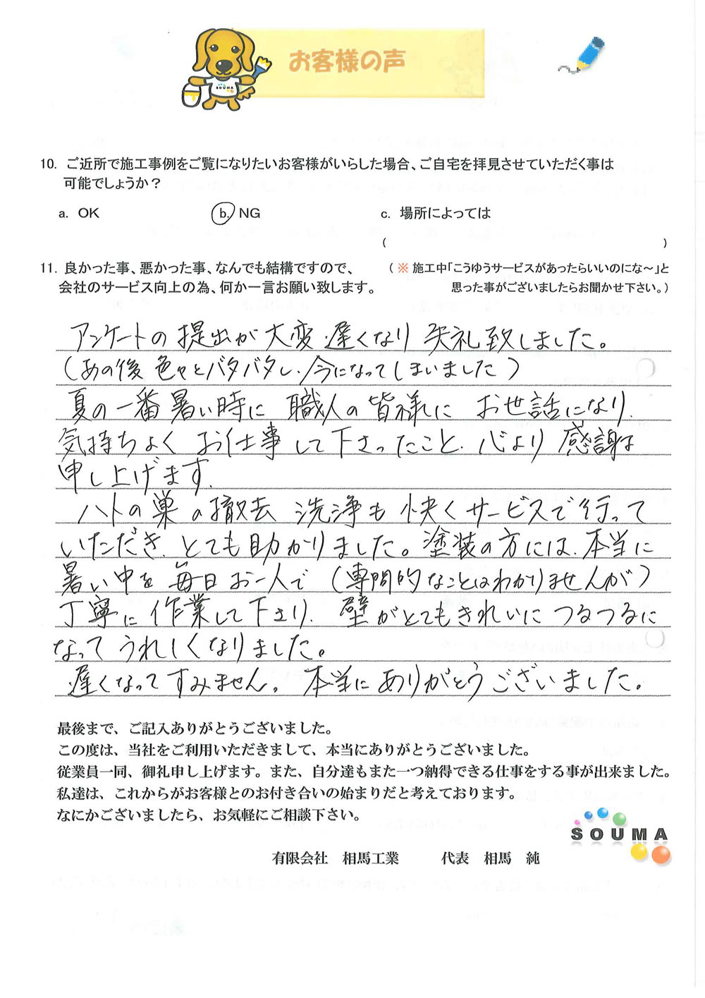 ハトの巣の撤去 洗浄も快くサービスで行っていただき、とても助かりました。