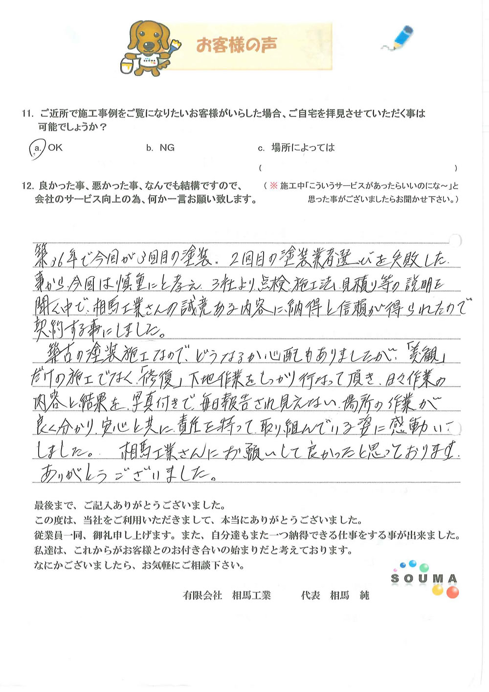 聞く中で、相馬工業さんの誠意ある内容に納得と信頼が得られたので契約する事にしました。