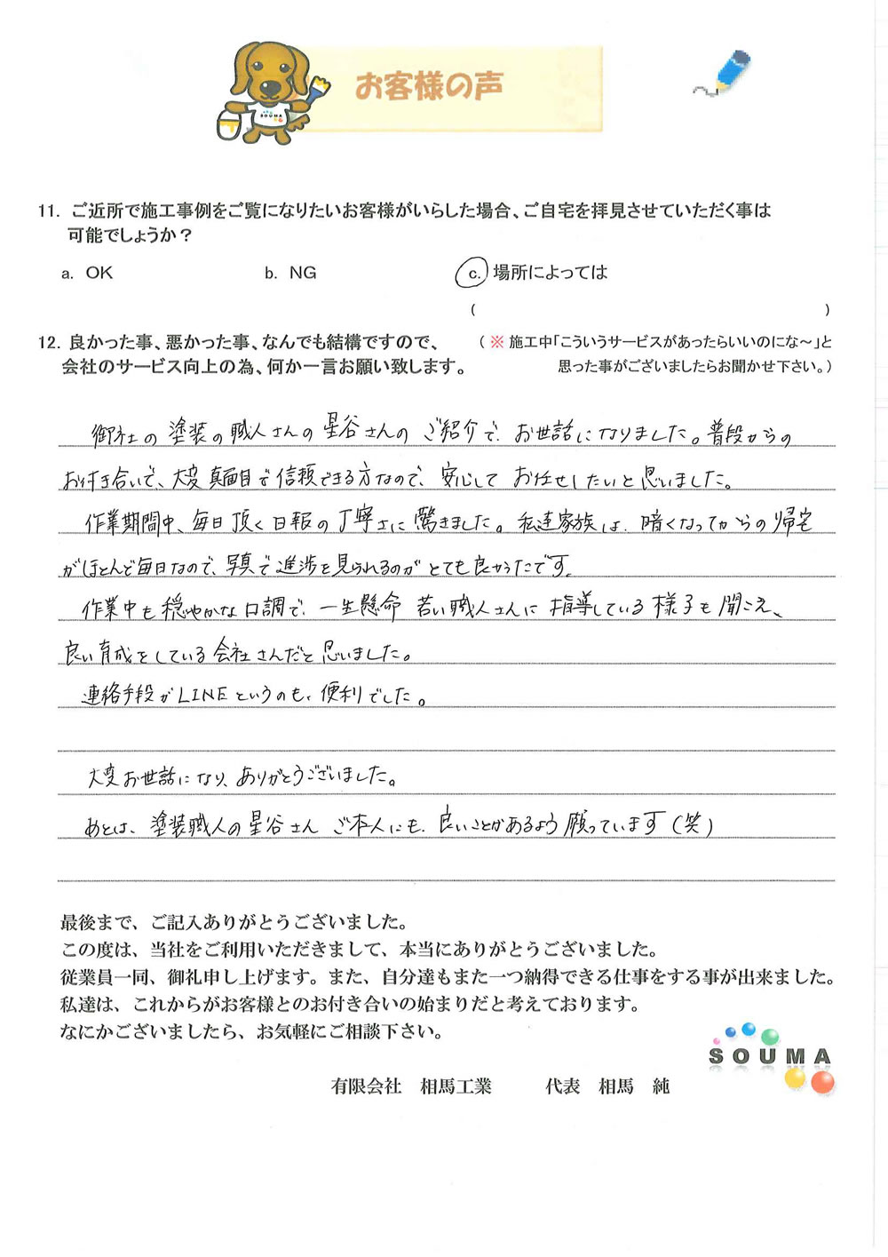 御社の塗装の職人さんの星谷さんのご紹介で、お世話になりました。